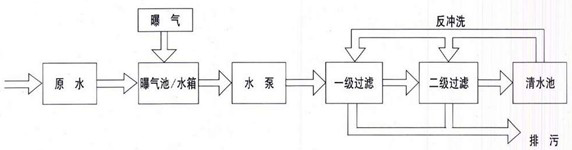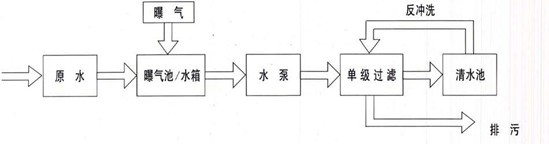 1、当地下水中含铁量为5-10mg/L、含锰量为1-2mg/L时或地下水中仅含铁而不含锰时,含铁浓度为10mg/L左右时,可采用曝气+单级除铁除锰滤器。工艺流程为: